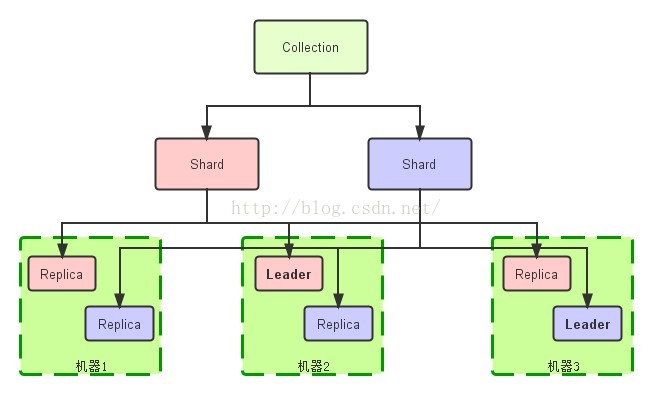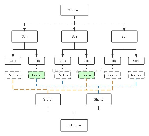 · SolrCloud collection shard关系:一个SolrCloud包含多个collection,collection可以被分为多个shards, 每个shard可以有多个备份(replicas),这些备份通过选举产生一个leader,