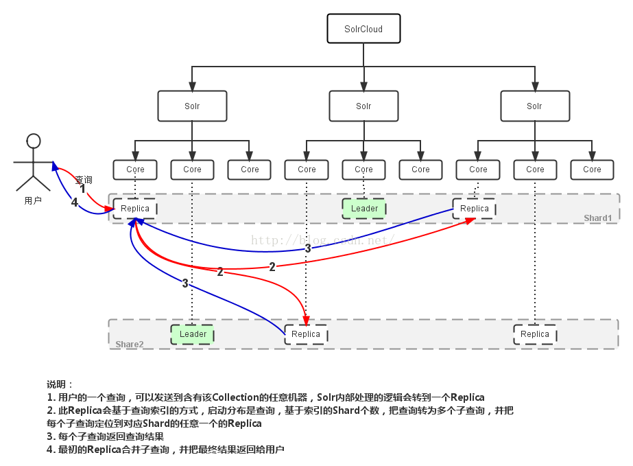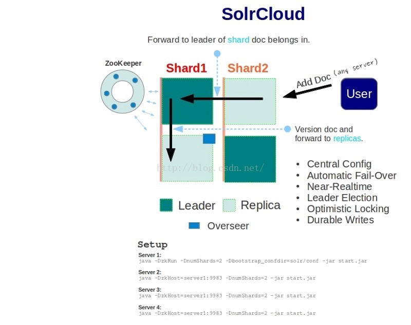 基本可以用上面这幅图来概述,这是一个拥有4个Solr节点的集群,索引分布在两个Shard里面,每个Shard包含两个Solr节点,一个是Leader节点,一个是Replica节点,此外集群中有一个负责维护集群状态信息的Overseer节点,它是一个总控制器。集群的所有状态信息都放在Zookeeper集群中统一维护。从图中还可以看到,任何一个节点都可以接收索引更新的请求,然后再将这个请求转发到文档所应该属于的那个Shard的Leader节点,Leader节点更新结束完成,最后将版本号和文档转发给同属于一个Shard的replicas节点。