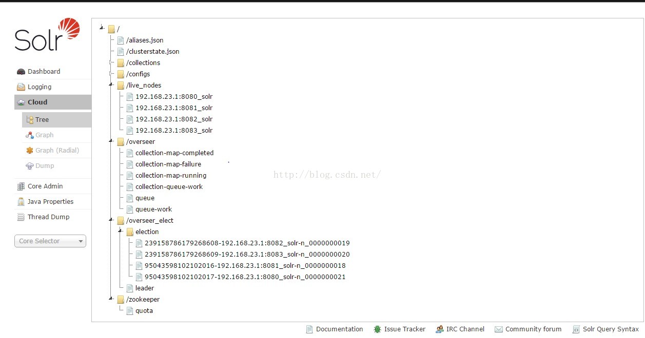 一般的zk读操作 Solr将最重要且信息最全面的内容都放在了cluseterstate.json中。这样做减少了,普通solr node需要关注的zk 结点数。除了clusterstate.json,普通的solr node在需要当前collection整体状态的时候,还会获取zk的/live_nodes中的信息,根据live_nodes中的信息,得知collection存活的node, 再从clusterstate.json获得这些node的信息。 这种处理,其实也好理解。假如一个solr node非正常下线,clusterstate.json中不一定会有变化,但/live_nodes中这个node对应的zk结点就消失了(因为是瞬时的)。