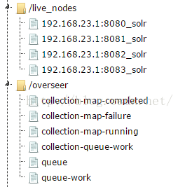 1、aliases.json 对colletion别名,另有妙用(solrcloud的build search分离),以后再写博客说明。 2、clusterstate.json 重要信息文件。包含了colletion ,shard replica的具体描述信息。 3、live_nodes ,下面都是瞬时的zk结点,代表当前存活的solrcloud中的节点。 4、overseer, solrcloud中的重要角色。下面存有三个重要的分布式队列,代表待执行solrcloud相关的zookeeper操作的任务队列。collection-queue-work是存放与collection相关的特办操作,如createcollection ,reloadcollection,createalias,deletealias ,splitshard 等。 5、queue则存放了所有与collection无关的操作,例如deletecore,removecollection,removeshard,leader,createshard,updateshardstate,还有包括节点的状态(down、active、recovering)的变化。 6、queue-work是一个临时队列,指正在处理中的消息。操作会先保存到/overseer/queue,在overseser进行处理时,被移到/overseer/queue-work中,处理完后消息之后在从/overseer/queue-work中删除。如果overseer中途挂了,新选举的overseer会选将/overseer/queue-work中的操作执行完,再去处理/overseer/queue中的操作。 注意:以上队列中存放的所有子结点,都是PERSISTENT_SEQUENTIAL类型的。 7、overseer_elect ,用于overseer的选举工作 8、colletcion,存放当前collection一些简单信息(主要信息都在clusterstate.json中)。 下面的leader_elect自然是用于collection中shard中副本集的leader选举的。