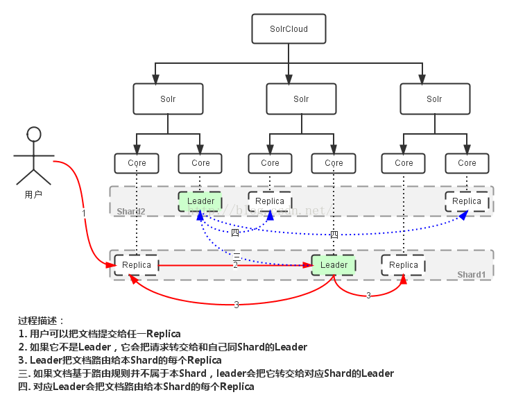 (3)SolrCloud在进行update时候,由于某种原因leader转发update至replica没有成功,会迫使replica进行recoverying进行数据同步。
