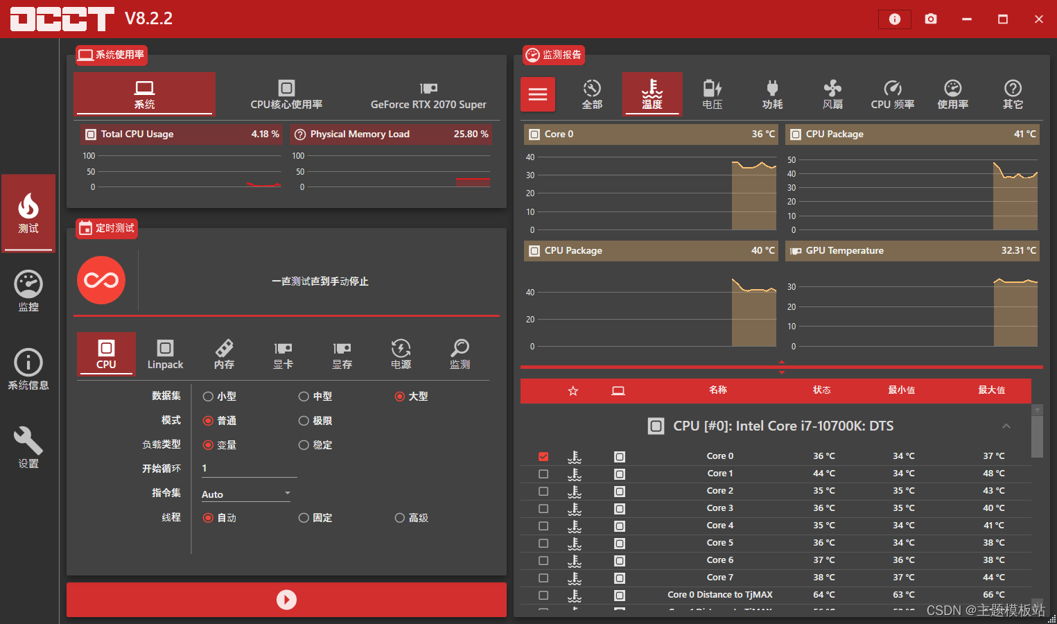 OCCT(OverClock Checking Tool),CPU/GPU电源检测工具,具有温度监控、GPU测试、CPU频率测试、