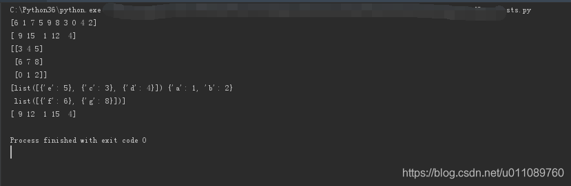import numpy as np new_arr = np.random.permutation(10) print(new_arr) new_arr1 = np.random.permutation([1, 4, 9, 12, 15]) # 参数为列表 print(new_arr1) arr = np.arange(9).reshape((3, 3)) new_arr2 = np.random.permutation(arr) print(new_arr2) new_arr3 = np.random.permutation([{"a": 1, "b": 2}, [{"e": 5}, {"c": 3}, {"d": 4}], [{"f": 6}, {"g": 8}]])# 子数组中的排列顺序不变 print(new_arr3) new_arr4 = np.random.permutation((1, 4, 9, 12, 15)) #可以传元组参数 print(new_arr4)