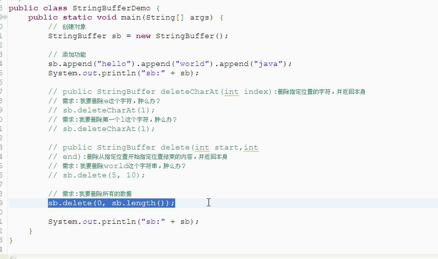 字符串截取:注意这里的返回值是String,不在是StringBuffer本身了