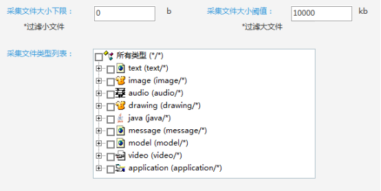 设置过滤:设置采集文件的类型,采集该类型的文件数据,设置采集文件大小下限,以过滤小文件,设置采集文件大小阈值,以过滤大文件。