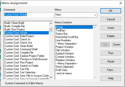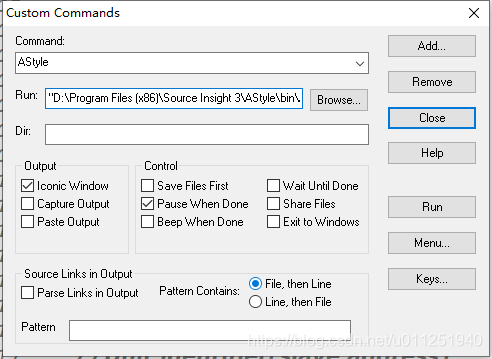 1、在Run:中添加命令为:"D:\Program Files (x86)\Source Insight 3\AStyle\bin\Astyle.exe" --style=ansi -s4 -S -N -L -m0 -M40 --convert-tabs --suffix=.pre %f