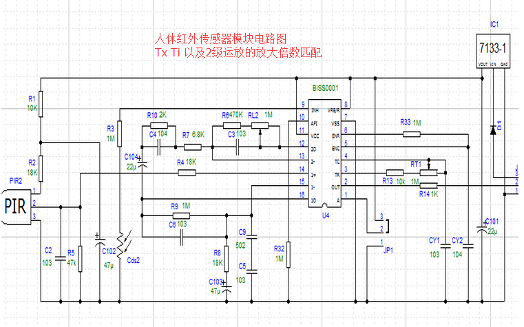 人体红外感应硬件 1、人体红外传感器模块电路,目前市面上有一种集成的PIR头,输出的就是感应后的电平变化。2、传感器输出阻抗较大,不适合直接电阻分压来进行降压,需要增加一个电压跟随器,使用LM358 ±5V电源供电,HT7660产生-5V电压,供给LM358电路。酒精传感器的ADC采样分压处理,使用LM358电压跟随器,然后再用电阻分压,原因是MQ3的阻抗太高,直接使用电阻分压不可以;同时注意LM358双电源供电,使用HT7660产生-5V的电压,供给LM358芯片。如果使用单电源,得到.