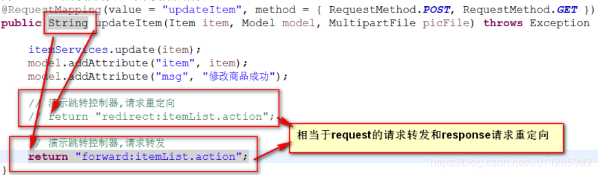 (1)转发:在返回值前面加"forward:",譬如"forward:user.do?name=method4" (2)重定向:在返回值前面加"redirect:",譬如"redirect:http://www.baidu.com"