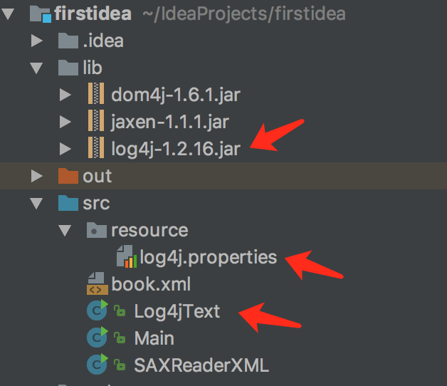 首先要导入log4j的依赖包,新建一个测试类Log4jText.java。然后将配置文件log4j.properties放在和测试类相同的路径的resource文件夹下。如图所示: