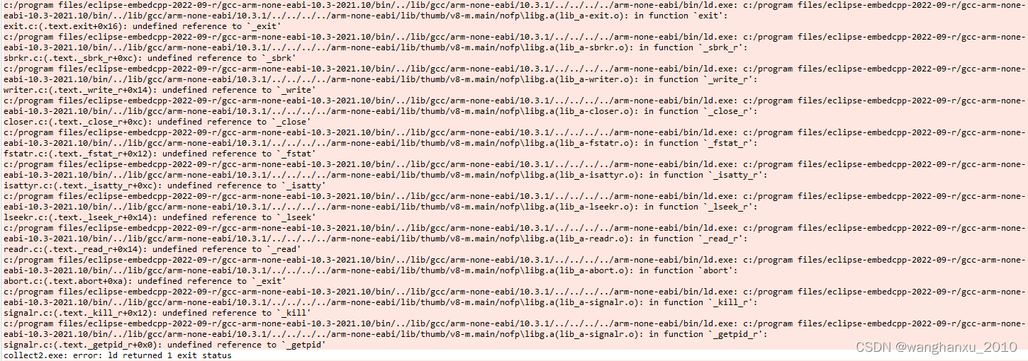 Eclipse gcc-arm-none-eabi-10.3-2021.10 链接过程中出现_exit, _sbrk, _write, _close未定义问题解决方法 Eclipse gcc-arm-none-eabi-10.3-2021.10 链接过程中出现_exit, _sbrk, _write, _close未定义问题解决方法