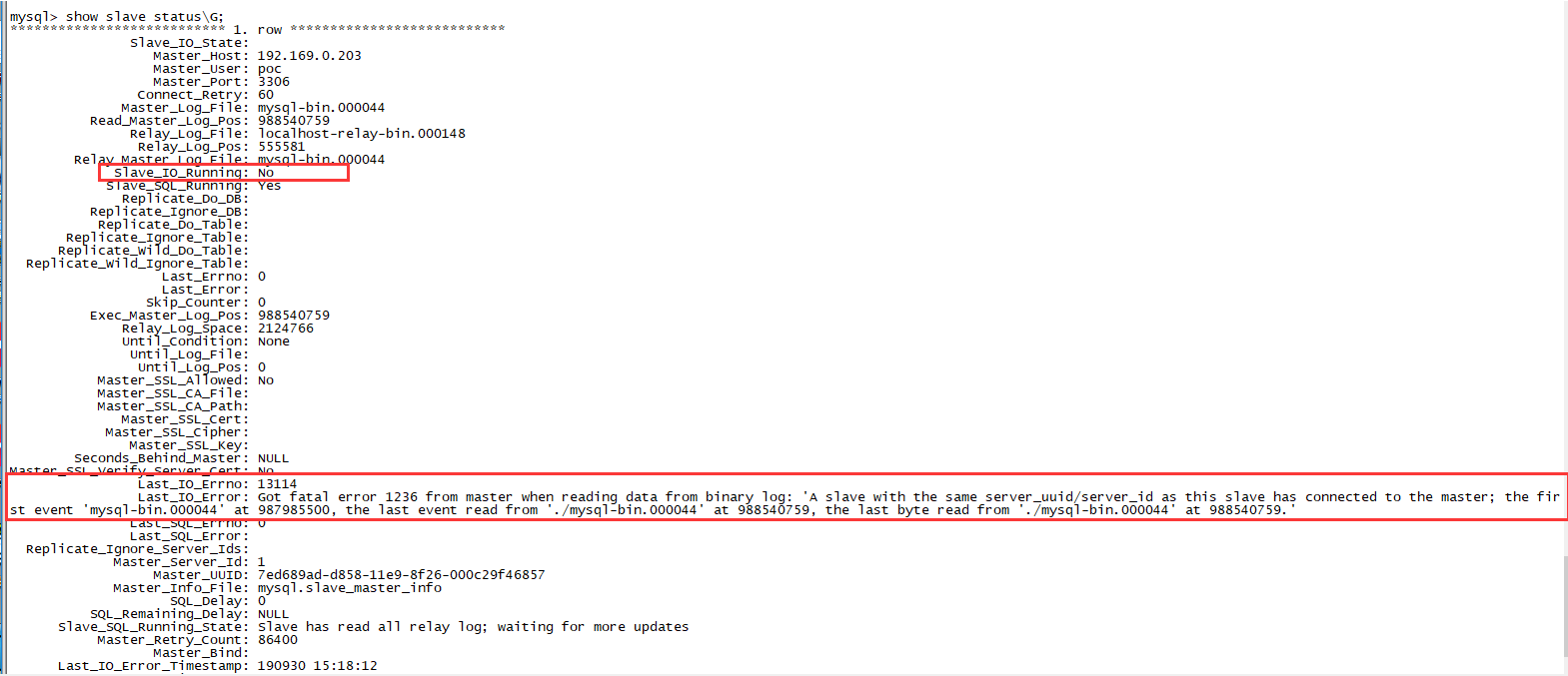 有一个slave和这个slave存在相同的server_uuid/server_id,已经连接了master。即存在两个或两个以上slave的server_uuid/server_id相同