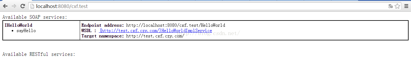 启动成功后,访问http://localhost:8080/cxf.test出现如下界面,表示已经成功: