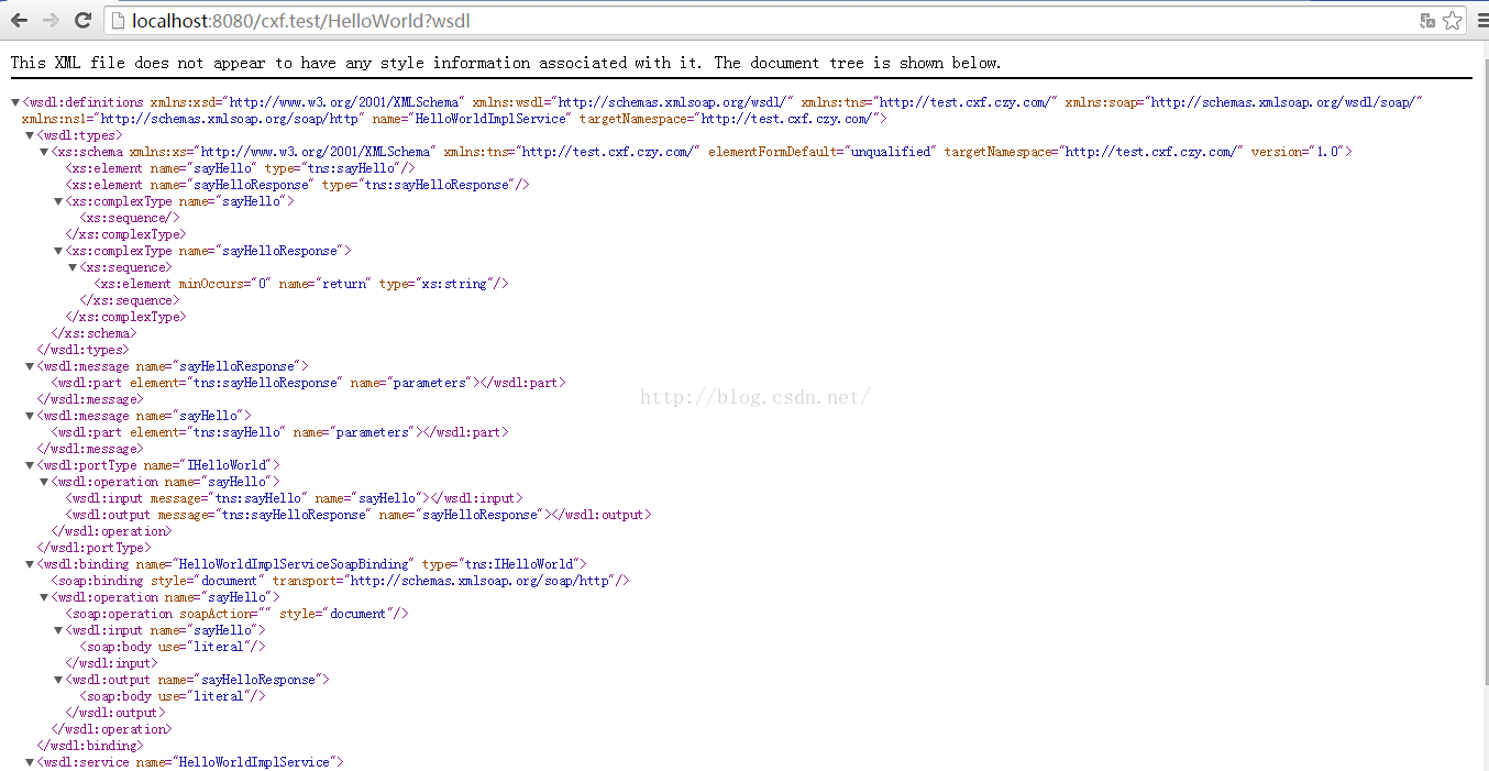 点击wsdl的链接地址(或直接访问http://localhost:8080/cxf.test/HelloWorld?wsdl),即可查看到相应的wsdl,如下图: