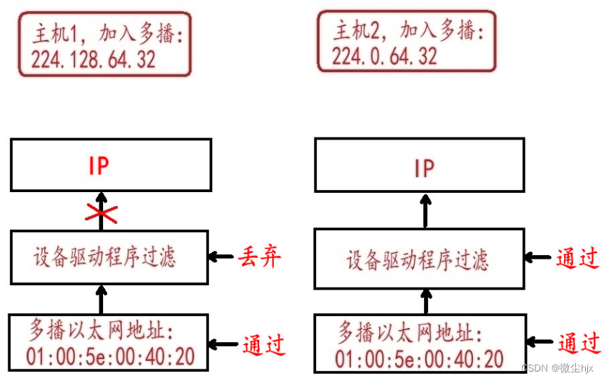 既然地址映射是不唯一的,那么设备驱动程序或IP层就必须对数据报进行过滤。因为网卡可能接收到主机不想接收的多播数据帧,如下图,假如主机 1 加入的多播为 224.128.64.32,主机 2 加入的多播为 224.0.64.32,我们想给 224.0.64.32 所在的多播组 ( 主机 2 ) 发送信息,数据经过网卡时,224.128.64.32 (主机 1 ) 和 224.0.64.32 (主机 2 ) 所在多播组的网卡都会收到数据,因为它们的 MAC 地址都是 01:00:5e:00:40:20。这时候,如果网卡不提供足够的多播数据帧过滤功能,设备驱动程序就必须接收所有多播数据帧,然后对它们进行过滤,这个过滤过程是网络驱动或IP层自动完成。