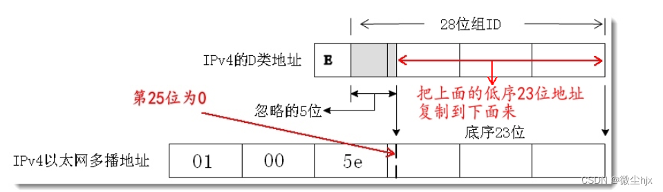 IPv4 的 D 类地址是多播地址。IEEE 把一块以太网多播组地址分给 IANA 以支持IP多播。块的地址都以01:00:5e 开头,第 25 位为 0,低 23 位为 IPv4 多播地址( D类地址 )的低 23 位。