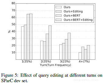 使用预测的查询是一种更现实的设置,在这种情况下,由于模型本身产生的错误查询,模型会受到错误传播的影响。对于没有utterance-table BERT embedding的模型,使用预测查询只能提高约1.5%。如图5所示,这是因为编辑机制对第4轮更有帮助,第4轮占了所有问题示例的一小部分。对于有utterance-table BERT embedding的模型,每轮查询的生成精度都有显著提高,从而降低了误差传播效果。在这种情况下,编辑方法提供了持续的改进,问题匹配准确率提高了7%,交互匹配准确率提高了11%。图5还显示了使用BERT进行query editing的好处。