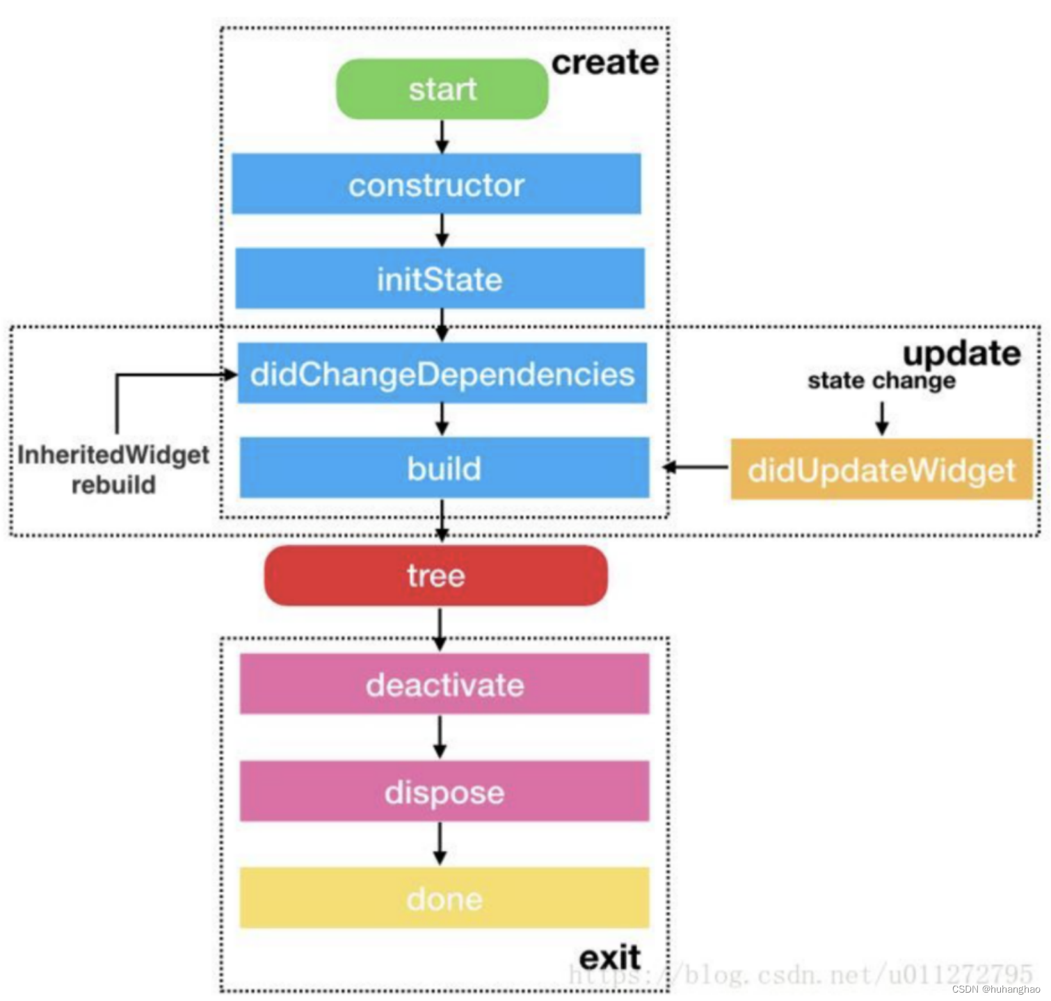· didUpdateWidget 当组件的状态改变的时候就会调用,比如调用了setState.