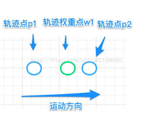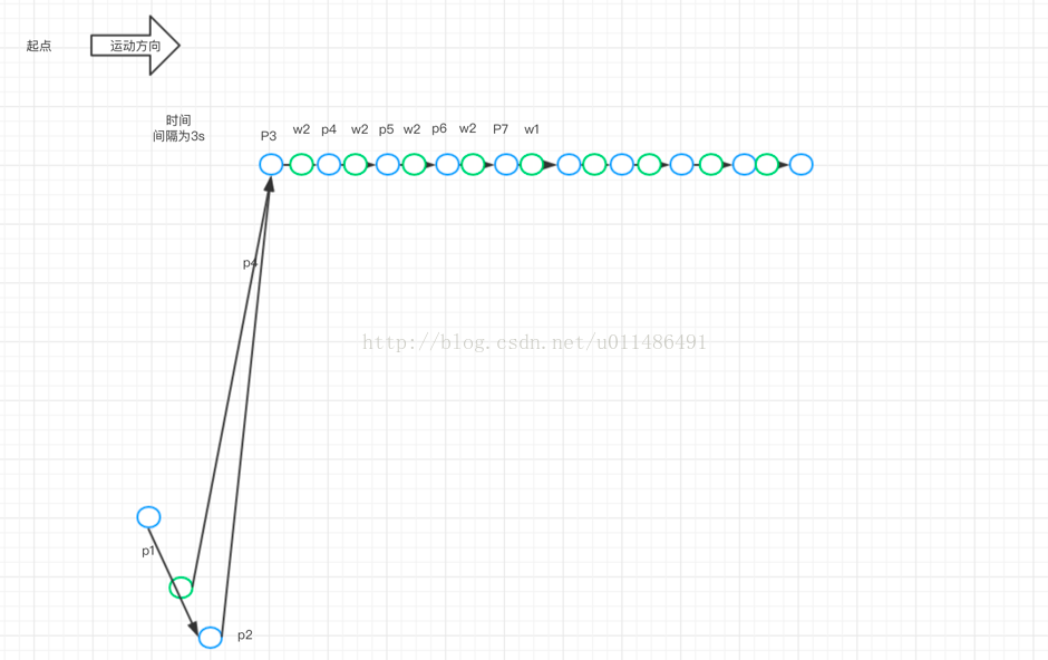 起始超过很多单位格子为要过滤的偏移点。P1、p2为不可接受偏移点,但是在起始不知道,当p3出现之后,发现距离有点大,则为p3生成新的权重点w2,连续判断5个点没有偏差,说明这几个点的轨迹是正确的则采用,将w1代表的点干掉,并将w1更新到w2这里。