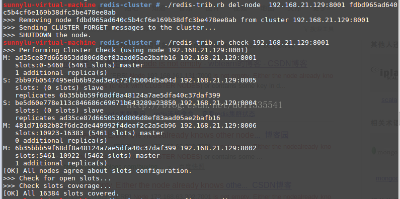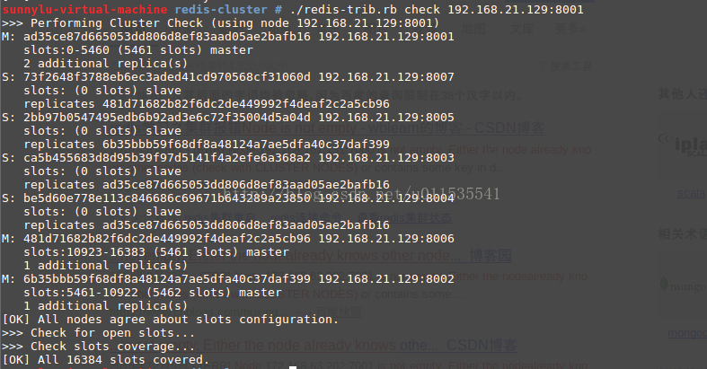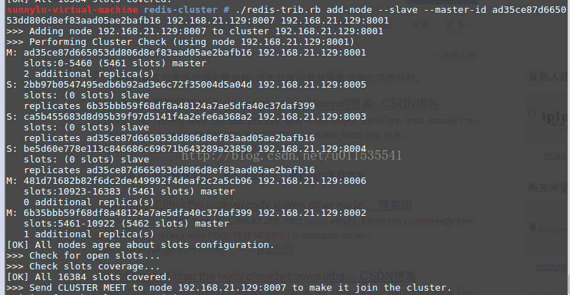 将8003重新加入集群,这次是作为8001的从节点,从下图可以看到虽然8001节点已经有两个从节点,但是并没有分配一个