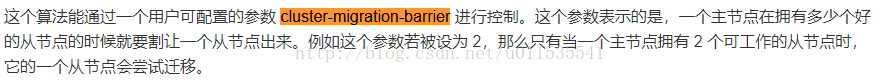 这个给定数量就是migration barrier。migration barrier 是1意味着一个从节点只有在其主节点另外至少还有一个正常工作的从