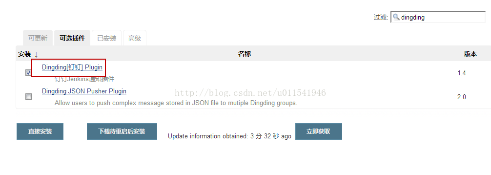 为了区别开发前后效果,我先在Jenkins上安装一个在线下载的插件。就是在插件管理,搜索dingding,然后点击下载安装。