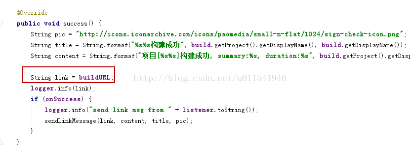 原作者实现了打包成功或者失败,点击标题都跳转到当前构建号的页面。这个功能是通用的,例如网站项目代码构建就没有下载功能。但是我们现在做的是APP自动化构建,肯定要给用户提供下载功能。思考一下,也就是说,我们在这个插件的界面,添加一个下载链接的输入控件,打包成功发送提醒这个方法,修改原来的链接,替换成用户输入的下载链接,这样打包成功提醒,点击就可以调整到下载包的web界面。