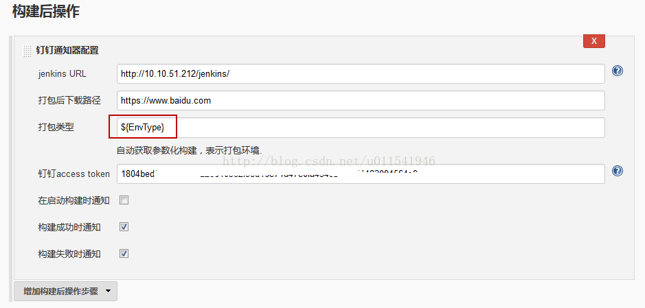 2017-12-20添加备注:上面每次构建后在钉钉插件UI打包类型文本输入框显示变量的值没有显示${EnvType},这个是一个bug,解决方法是这样的,找到DingdingNotifier.java下的getEnvType方法,return 语句改成return envType,这个时候就不需要去环境变量池去取出变量的值,因为我们在钉钉提醒插件前端UI打包类型文本输入框,还是建议一致保持变量的显示,这样可能避免疑惑。