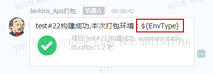 但是这个结果不会影响到你下一次打包,因为当前文本输入框还是记住了你配置的时候填写的${EnvType},这个会随着每次打包选择不同类型而发生变化。本次二次开发举例就介绍完成,你可以试试,在钉钉消息提醒,加入一个字段,例如获取jenkins当前打包人员的账号,显示每次打包是那个人触发的构建。