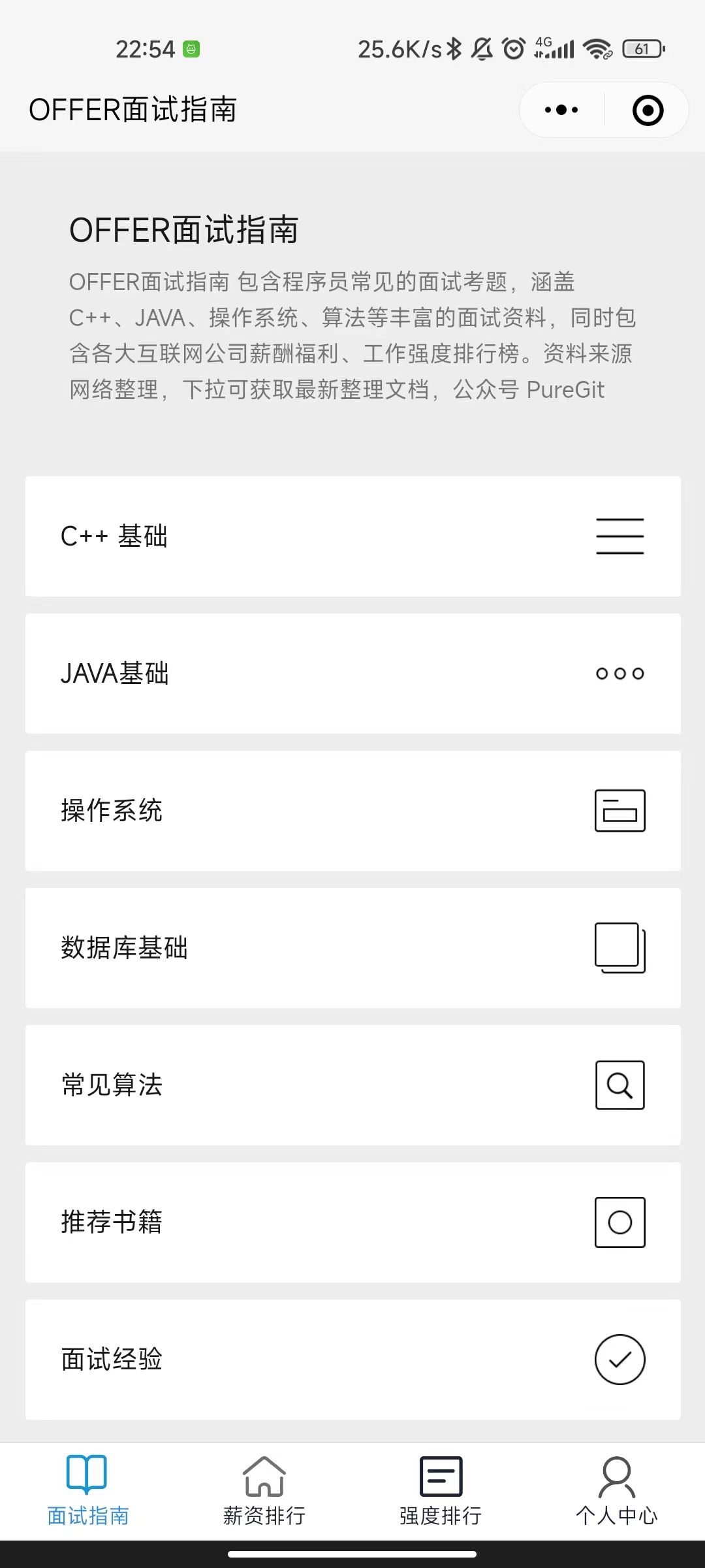 OFFER面试指南 OFFER面试指南包含程序员常见的面试考题,涵盖C++、JAVA、操作系统、算法等丰富的面试资料。所有资料将同步更新到微信小程序,同时,微信小程序也包含各大互联网公司薪酬福利、工作强度排行榜,欢迎关注使用。 小程序 截图预览 链接: C++面试合集.pdf JAVA面试合集.pdf