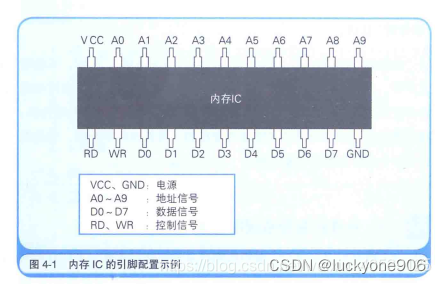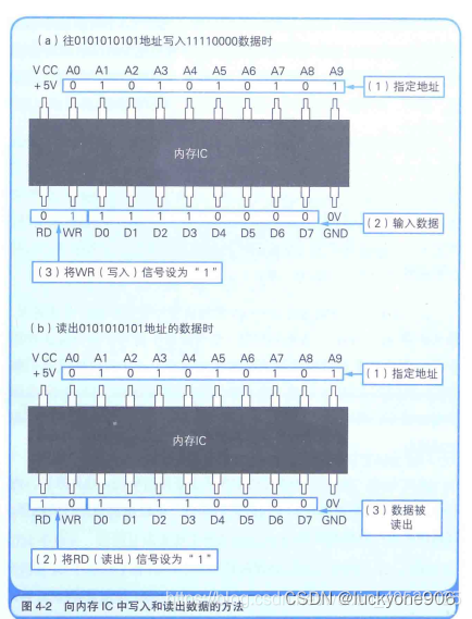 图4-1是内存IC的引脚配置示例。这个IC中能存储多少数据呢?数据信号引脚由D0~D7共8个,表示一次可以输入输出8位(1字节)的数据。此外,地址信号引脚有A0~A9共10个,表示可以指定0000000000~1111111111共1024个地址。而地址用来表示数据的存储场所,因此我们可以得出这个内存IC中可以存储1024个1字节的数据。因为1024 = 1 K 1024=1K1024=1K,所以这个内存IC的容量就是1KB。假设计算机的内存是512M,这就相当于512000个1KB的内存IC。
