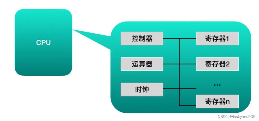 CPU和内存都是由许多晶体管组成的电子部件,可以把它比作计算机的心脏和大脑。它能够接收数据输入,执行指令并且处理相关信息。它与输入/输出(I / O)设备进行通信,这些设备向 CPU 发送数据和从 CPU 接收数据。从功能上来看,CPU的内容是由寄存器、控制器、运算器和时钟四部分组成的,各个部分之间通电信号来连通。