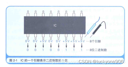 计算机内部是由IC(Intergrated circuit,集成电路,其由很多晶体管组成)这种电子部件构成的。CPU和内存就是IC的一种。IC的一个引脚只能表示两个状态,因此计算机的信息只能用二进制来处理。