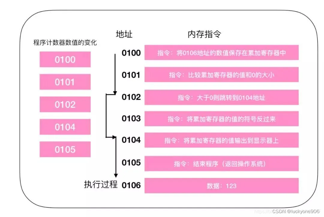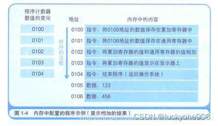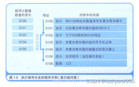 事实上,每个指令和数据都有可能分布在不同的地址上,但是为了更好的说明,就把组成一条指令的内存和数据放在了一个内存地址上。地址0100是程序运行的起始位置,Windows等操作系统把程序从硬盘复制到内存以后,就会将程序计数器作为设定为起始位置0100,然后再执行程序,每次执行一条指令后,程序计数器的数值就会增加1,或者是直接指向下一条指令的地址。随后,CPU会根据程序计数器的数值,从内存中读取命令并且执行,换言之,程序计数器控制着程序的流程。