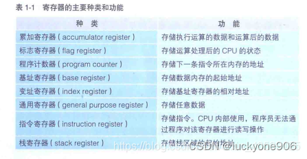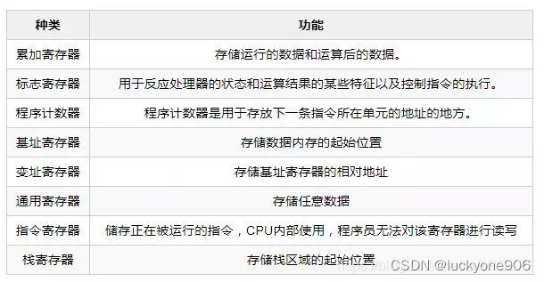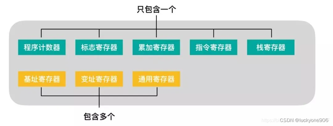 其中,程序计数器、标志寄存器、累加寄存器、指令寄存器和栈寄存器只有一个,其他寄存器一般有好几个。