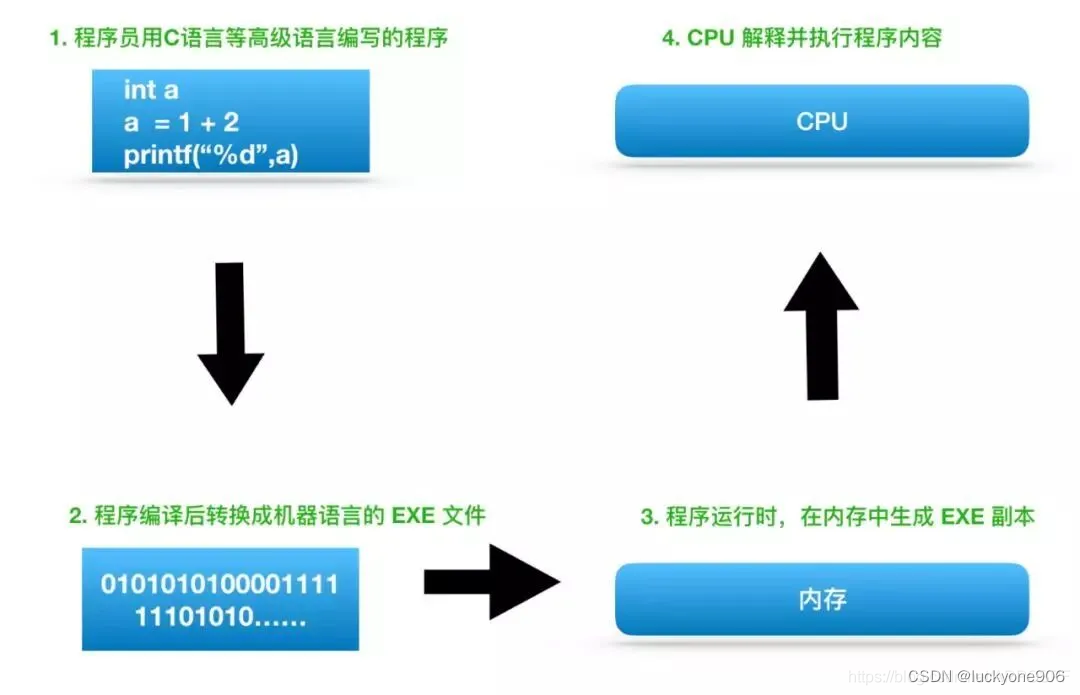 计算机的主要存储设备就是内存和磁盘。磁盘中存储的程序,必须要加载到内存后才能运行。因为CPU需要通过内部程序计数器来指定内存地址,然后才能读出程序。