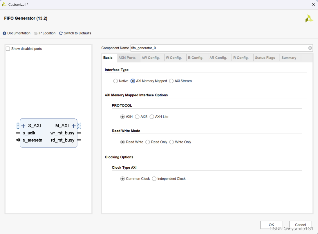 对于AXI memory mapped的FIFO Generator IP核,通常包含多个配置选项卡,以便用户可以根据其应用需求进行定制。以下是一些常见的配置选项卡示例,但请注意,这些可能因Vivado的版本更新而略有变化: