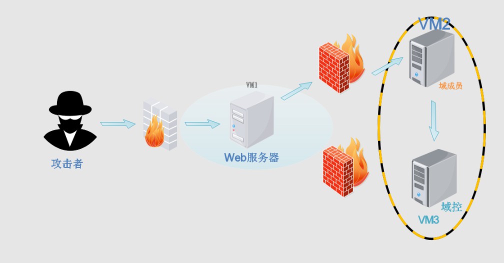 前言之前在某公众号发现了一个挺不错的靶场平台,觉得对于我这个菜鸟来说是一个很好的机会,于是尝试进行学习!因为其他一些事情的耽搁和自己知识储备的不足(主要),时间大概过了两个月,终于断断续续地完成了第一个靶场,也算是对很多知识点的一个入门了。记录一下学习过程,作为往后学习的一个经验积累和参考资料。一、环境搭建1.1环境搭建测试下载导入三个虚拟机后,根据拓扑与环境,win7(VM1)需要能够访问外网和内网,而win2003(VM2)跟win2008(VM3)则只能内网通信。(虚拟机所有统一密码:hon