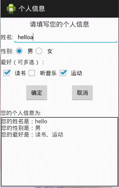 以个人呢信息填写小demo来练习使用textView、editText、radioGroup、radioButton、checkBox小控件的使用: