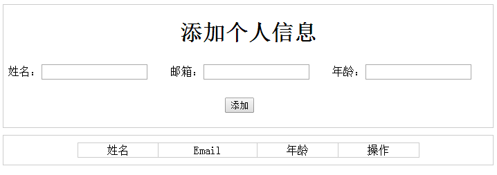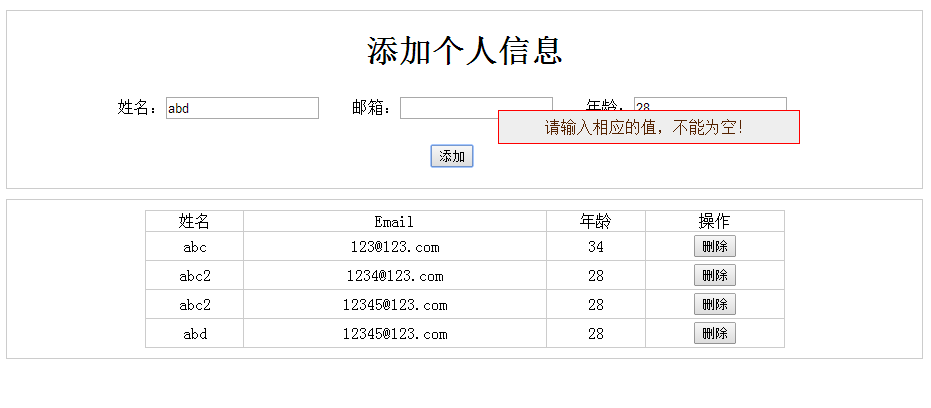 点击添加可以把相应的信息添加到下面的表格中,当某一项为空的时候给出提示不能为空;