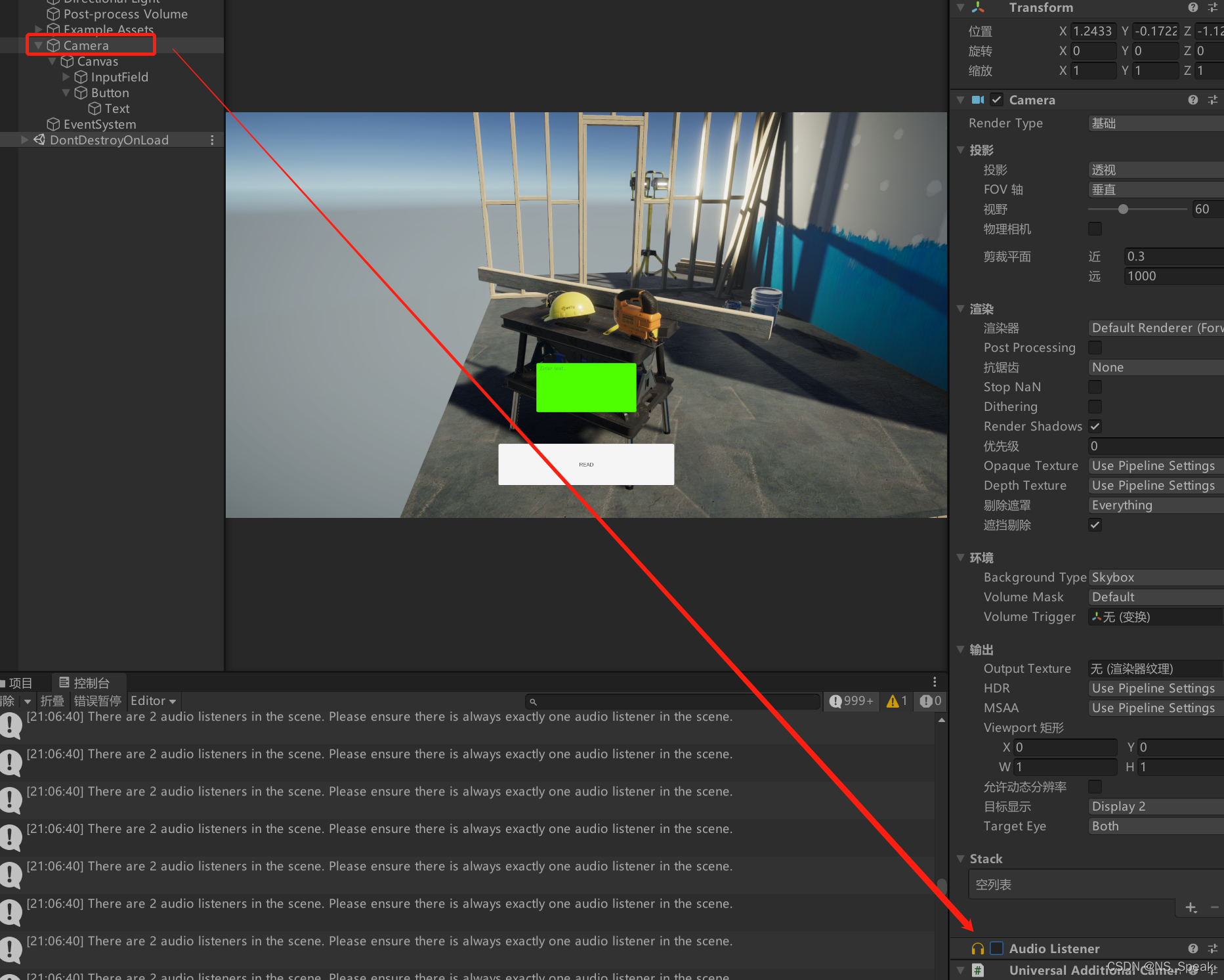 上图中cavas固定,且不影响3D场景的正常使用,可能有人注意到下面的tip,只需要把副相机的Audio listener脚本取消即可,如下图: