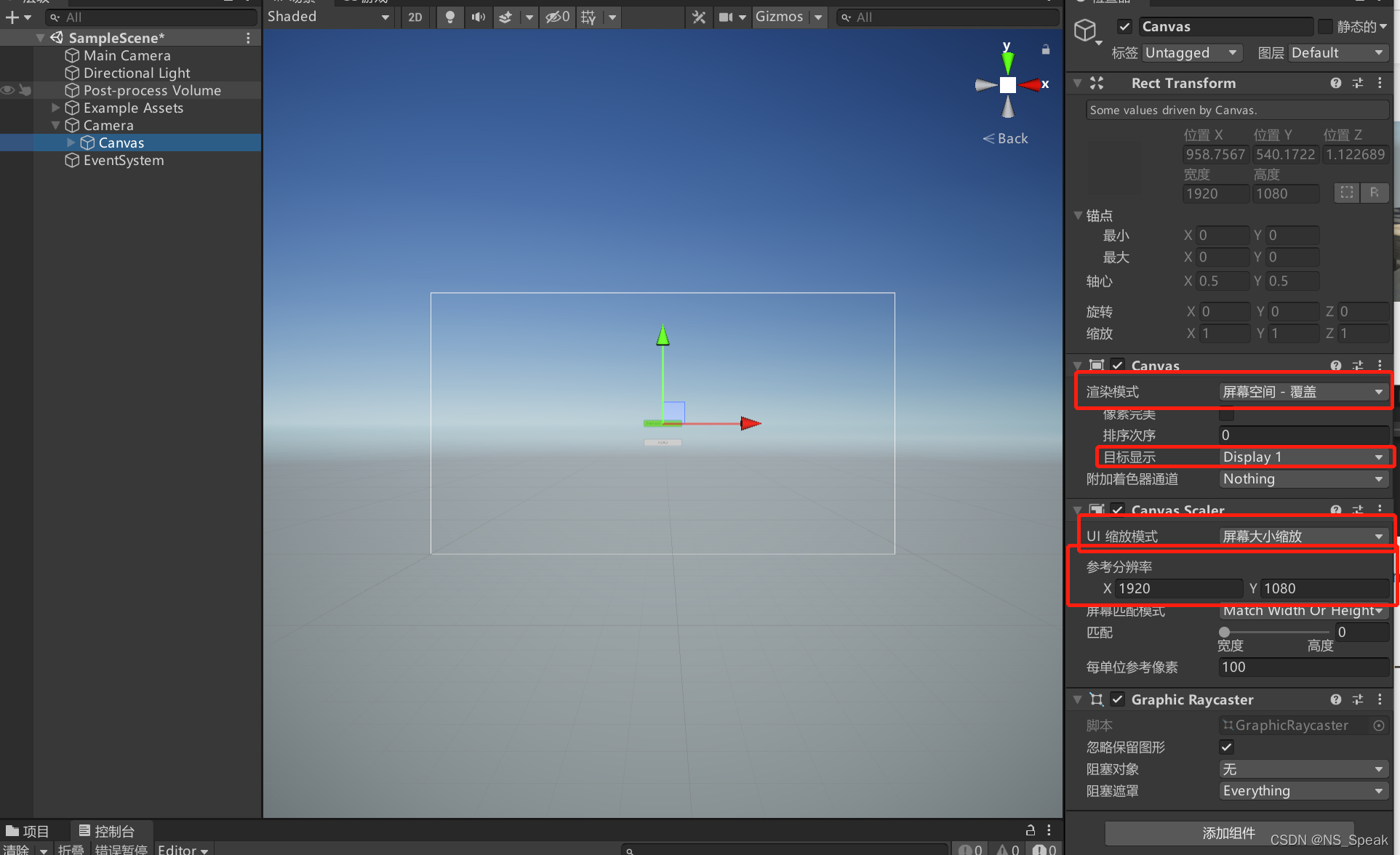 注意上中Canvas所需设置,然后双击副相机内的canvas添加一些组件,以供观察效果。