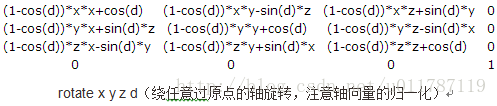 void rotat(Mat &a, double x, double y, double z, double d) // 旋转(三维),以(0,0,0),(x,y,z)线段为旋转轴,旋转d度