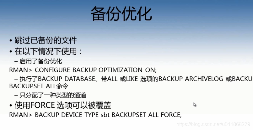 RMAN> CONFIGURE BACKUP OPTIMIZATION ON;