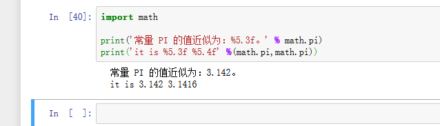 print('常量 PI 的值近似为:%5.3f。' % math.pi)