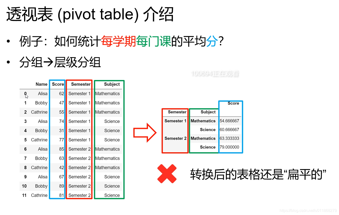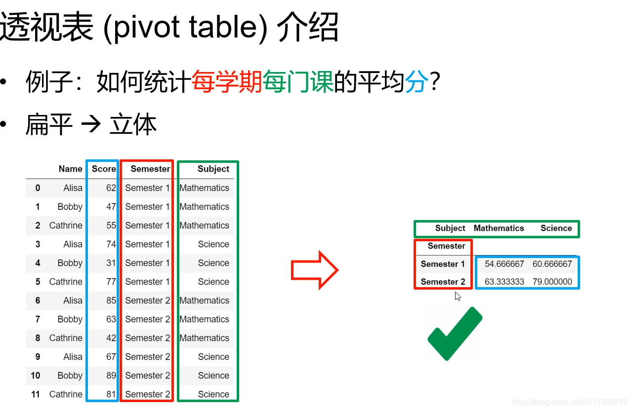 df.pivot_table(values='Score',index='Semester',columns='Subject') # 数据透视表