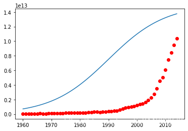 For an example, we're going to try and fit a non-linear model to the datapoints corrensponding to China's GDP from 1960 to 2014. We download a dataset with two columns, the first, a year between 1960 and 2014, the second, China's corresponding annual gross domestic income in US dollars for that year.