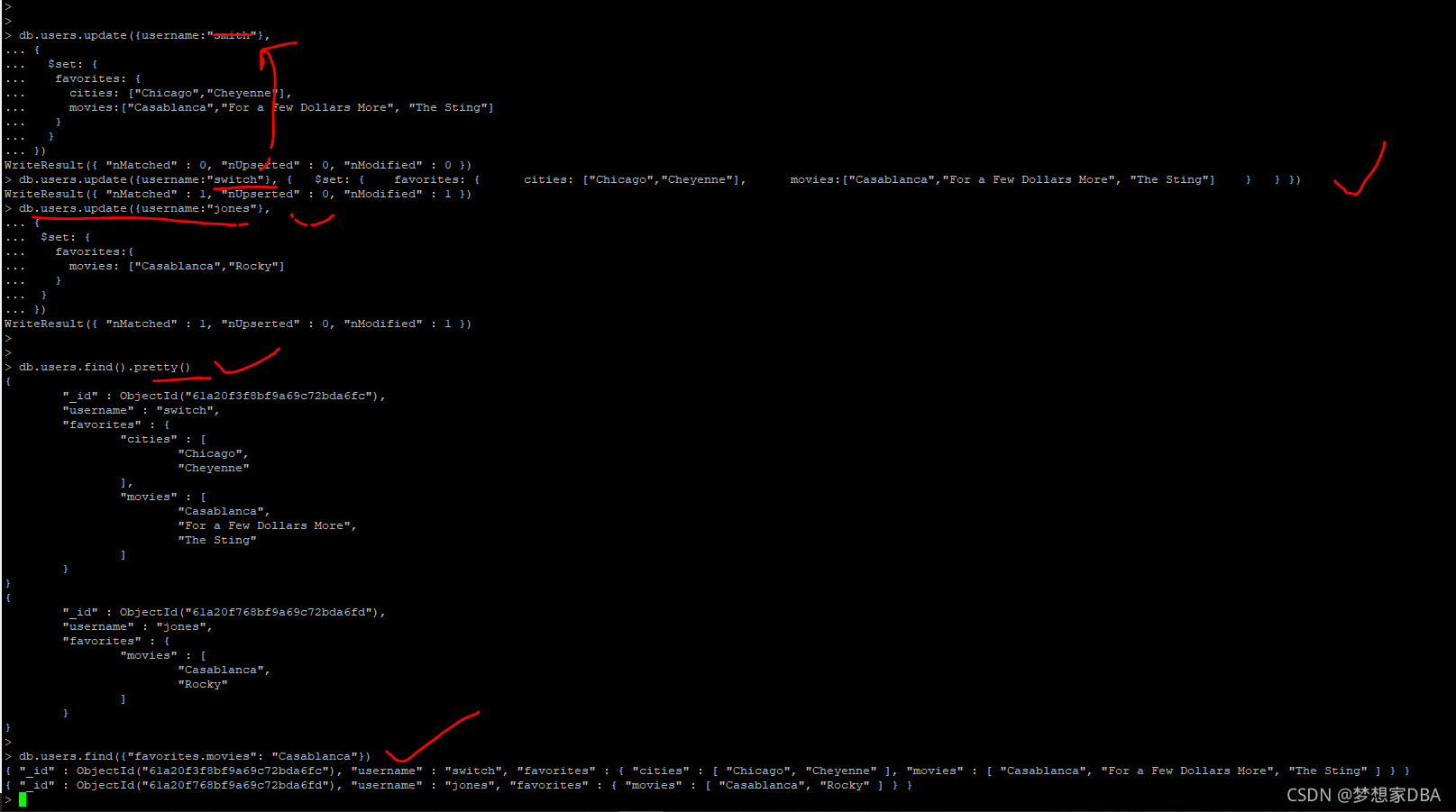 { "_id" : ObjectId("61a20f768bf9a69c72bda6fd"), "username" : "jones", "favorites" : { "movies" : [ "Casablanca", "Rocky" ] } }