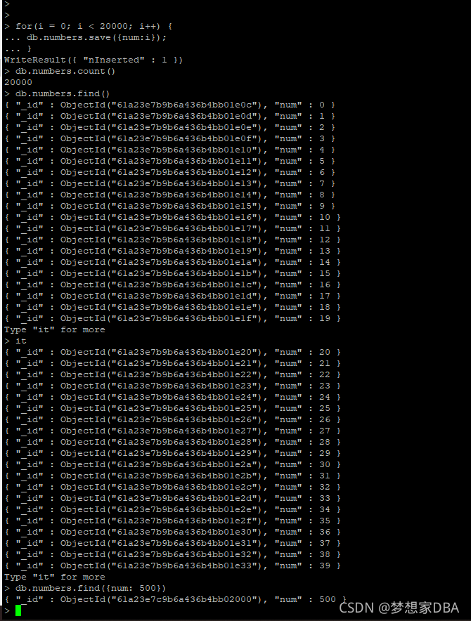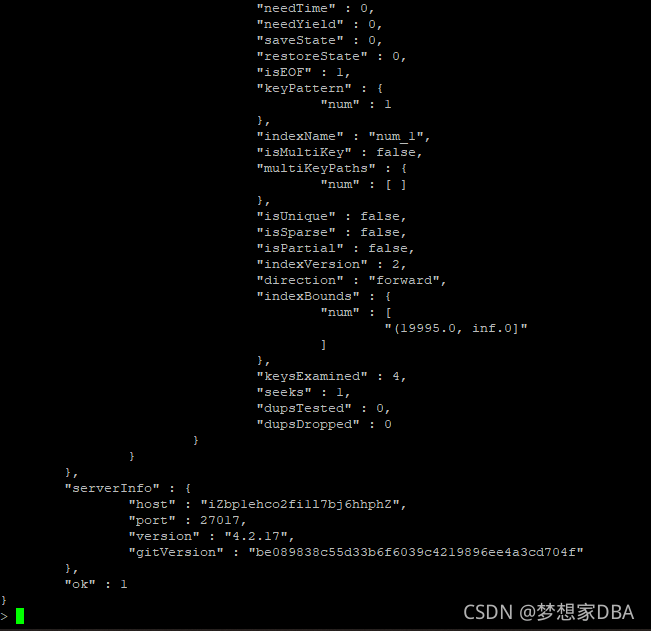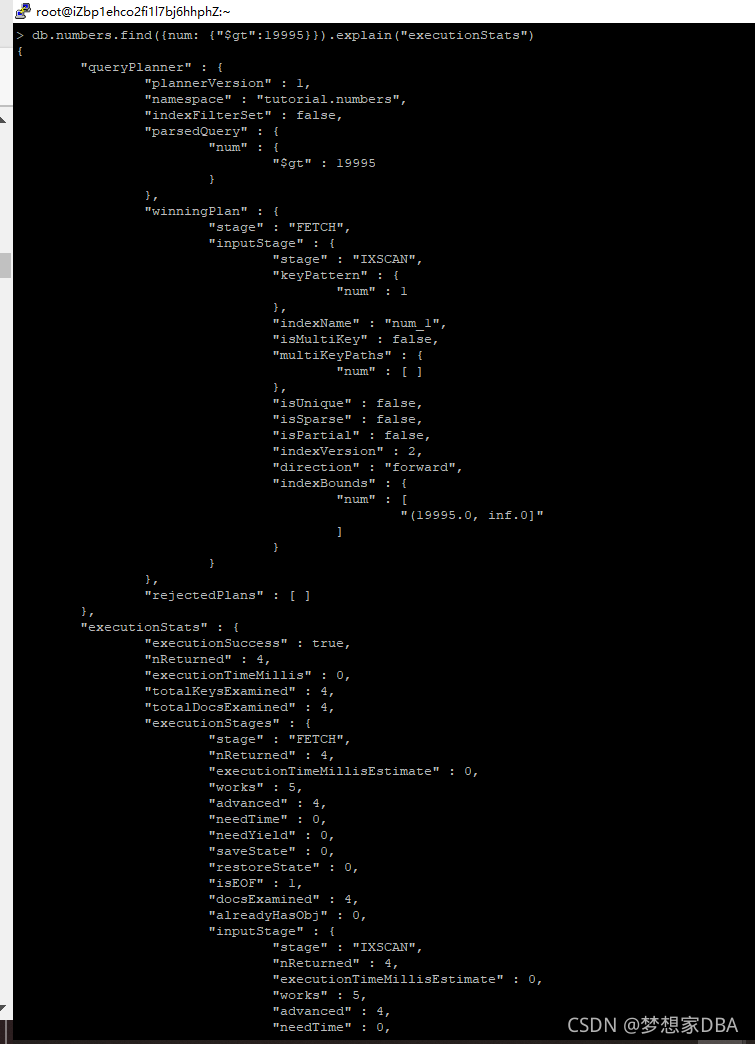 > db.numbers.find({num:{"$gt": 19995}}).explain("executionStats")