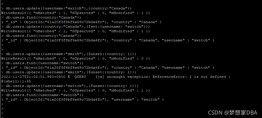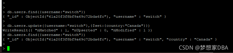 > db.users.update({username:"switch"},{$set:{country:"Canada"}})