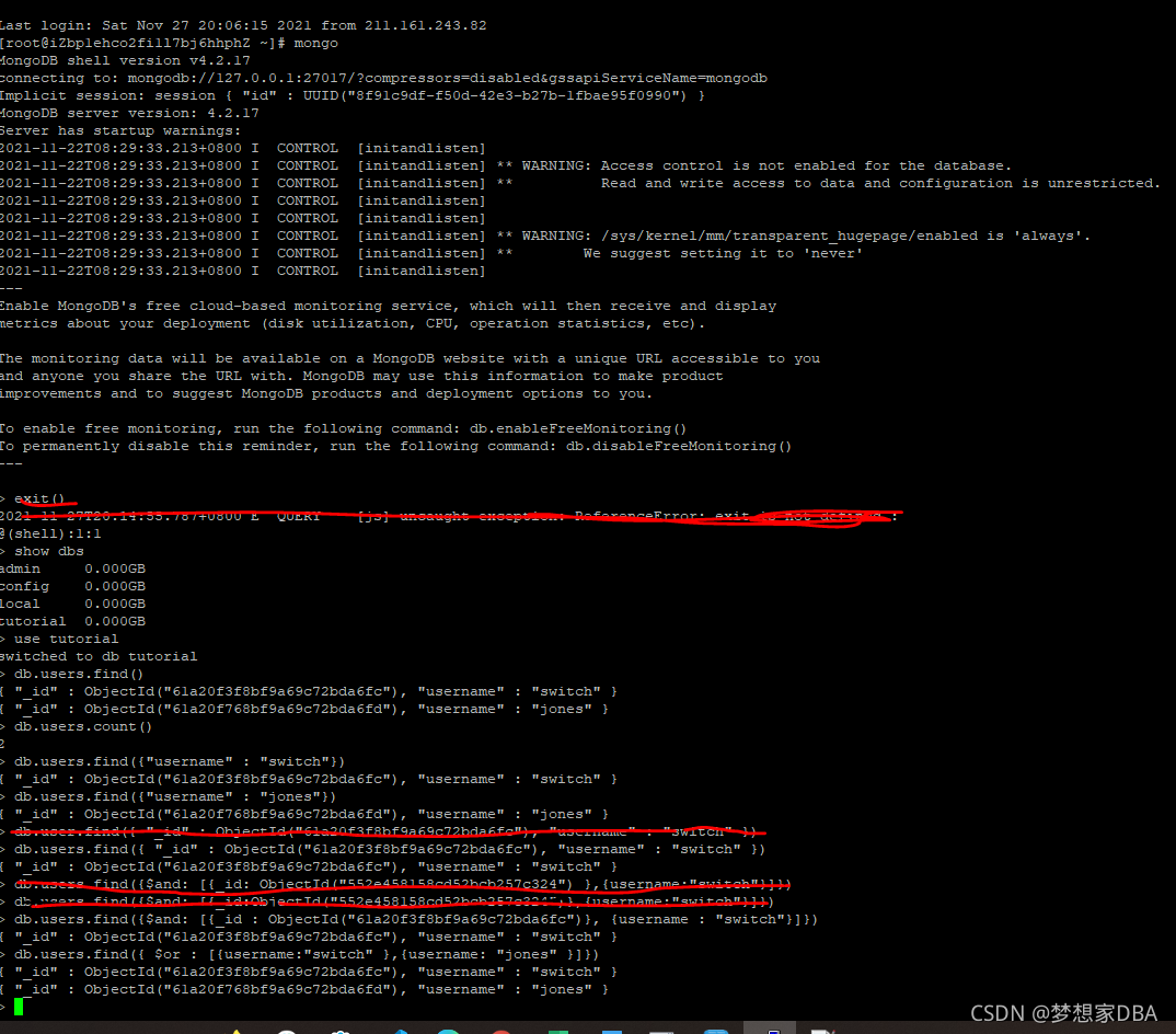 > db.users.find({ "_id" : ObjectId("61a20f3f8bf9a69c72bda6fc"), "username" : "switch" })